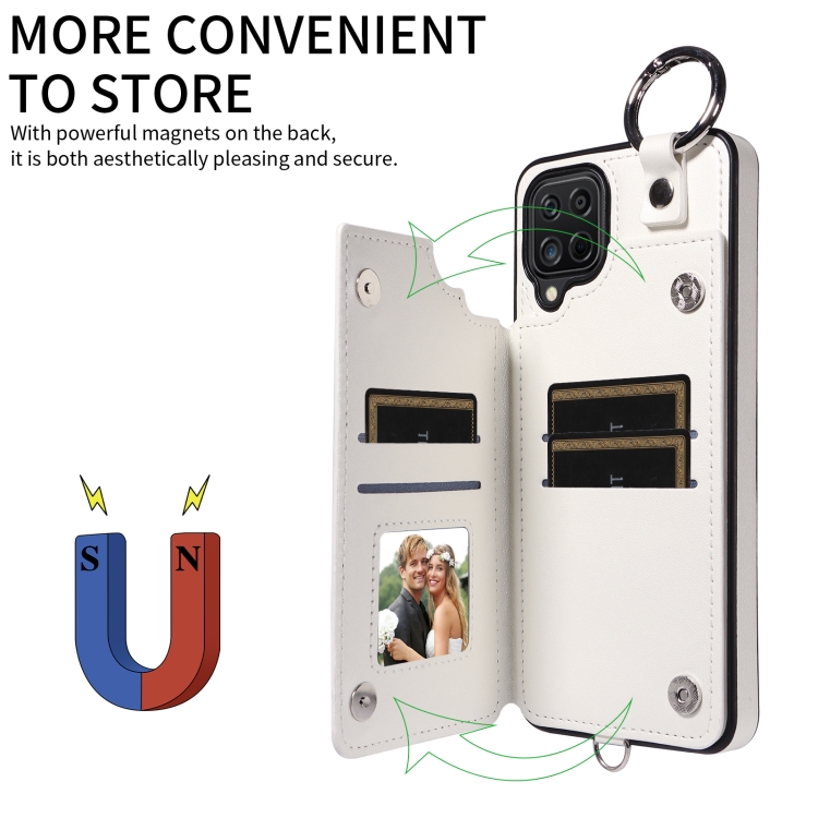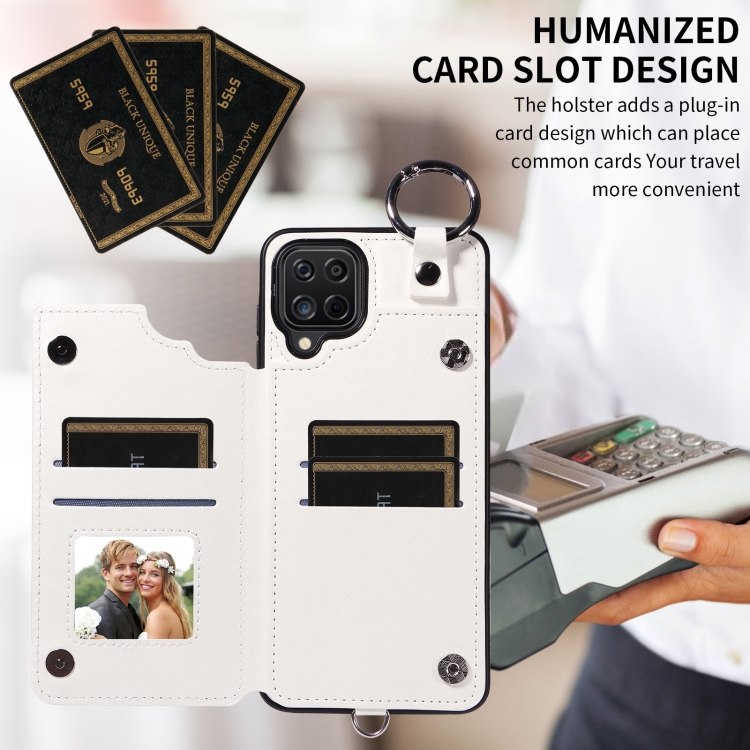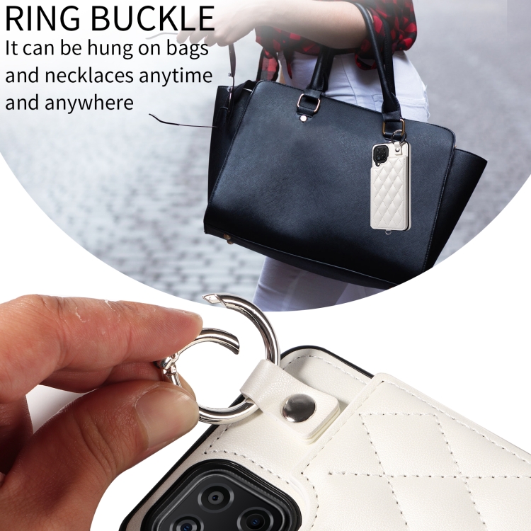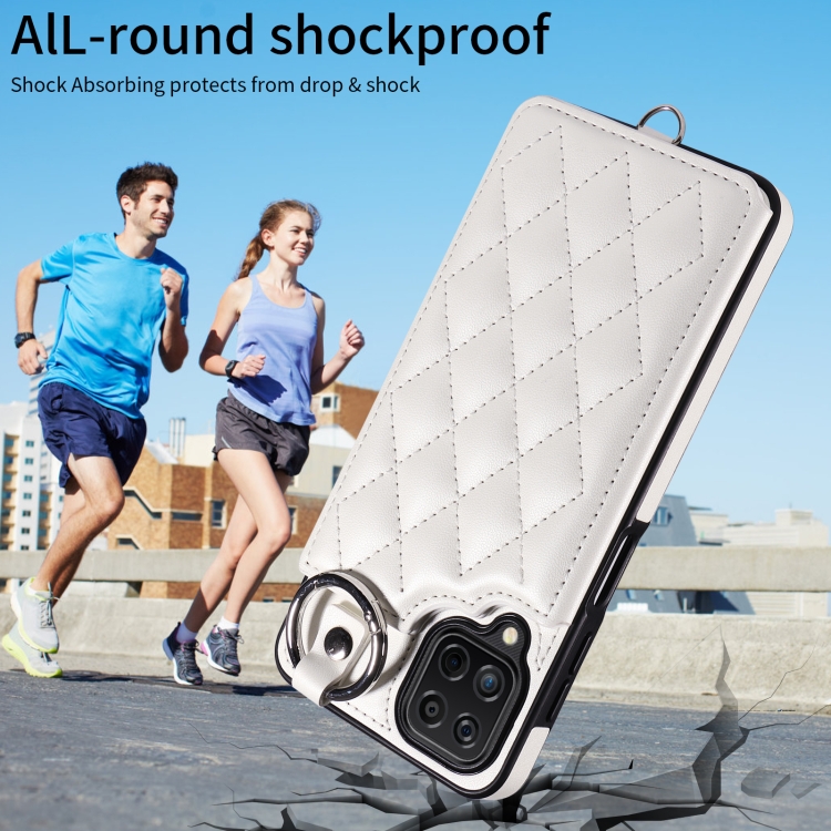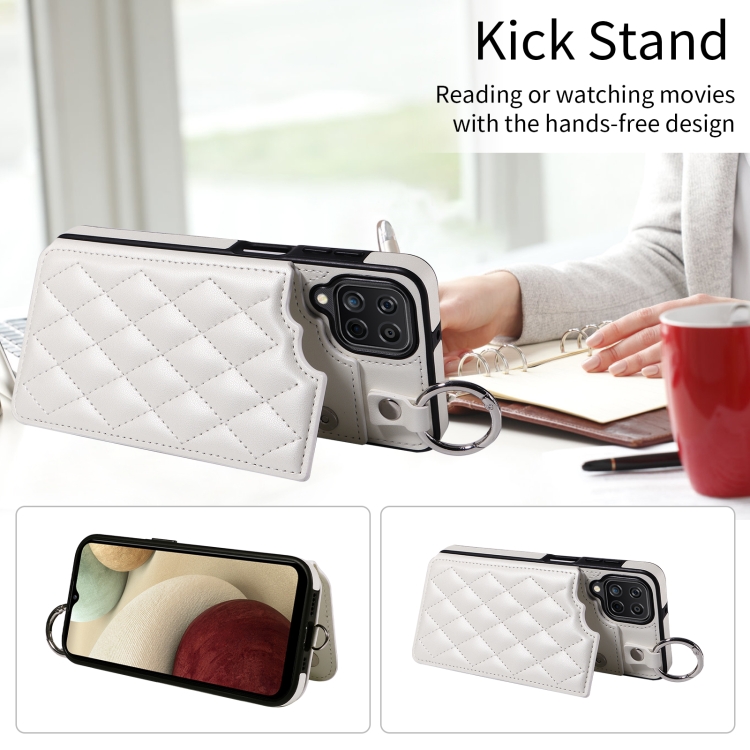 Estuche para Teléfono Samsung Galaxy A12 4G con Bolsa para Tarjetas Textura Rómbica y Cordón Corto (Blanco)