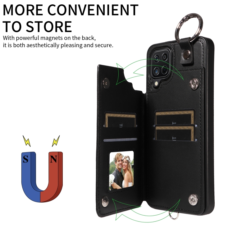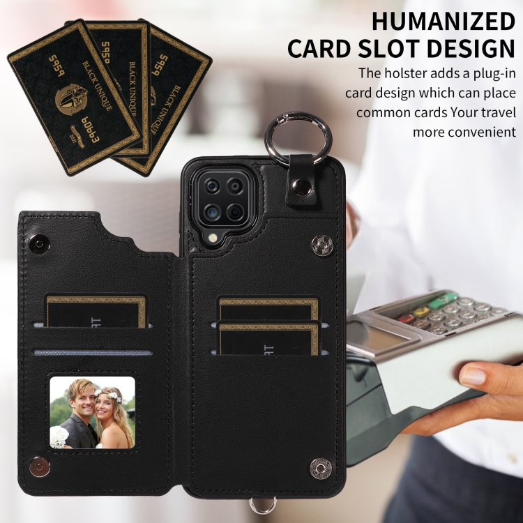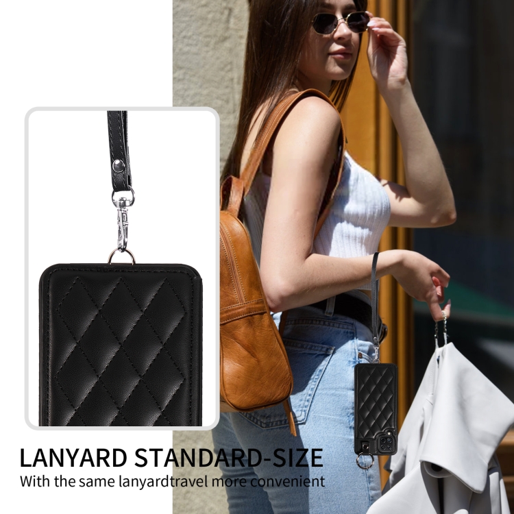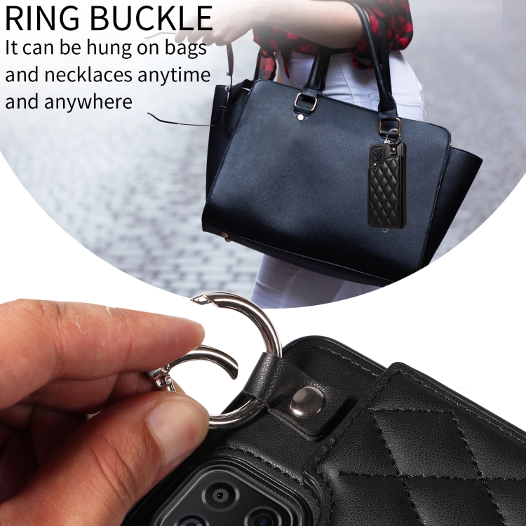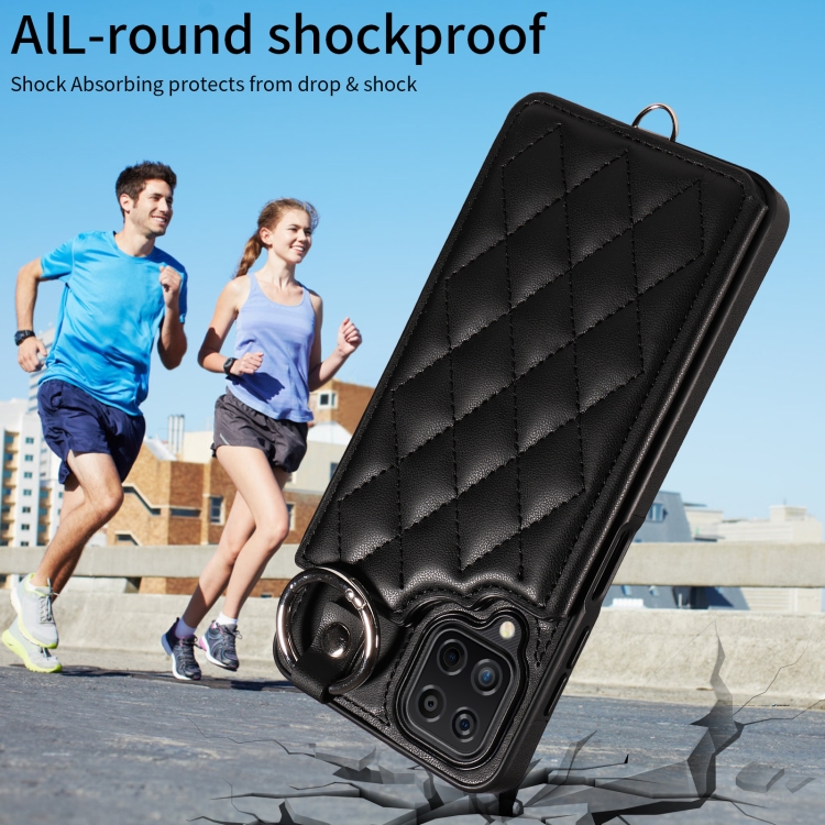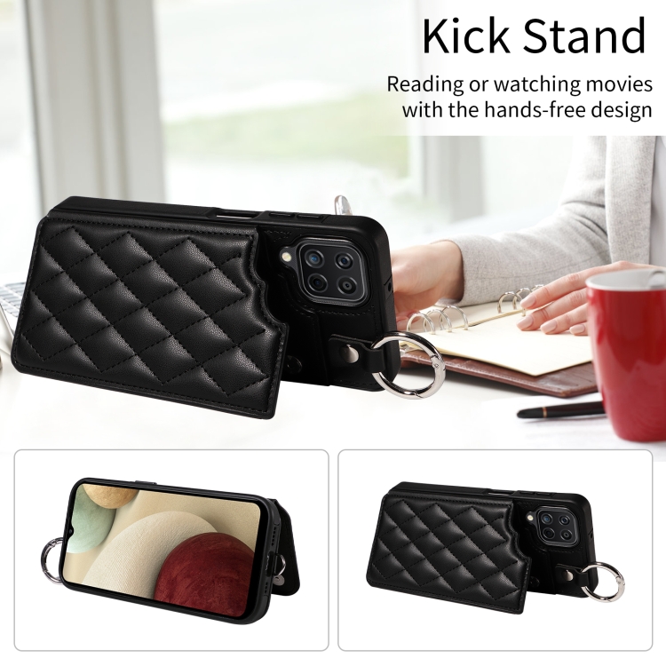 Estuche para Teléfono Samsung Galaxy A12 4G con Bolsa para Tarjetas Textura Rómbica y Cordón Corto (Negro)