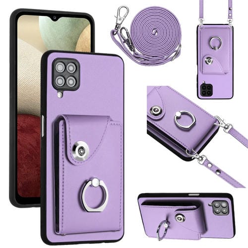 Funda para Teléfono Samsung Galaxy A12 con Soporte para Anillo y Bolsa para Tarjeta con Cordón Largo (Púrpura)