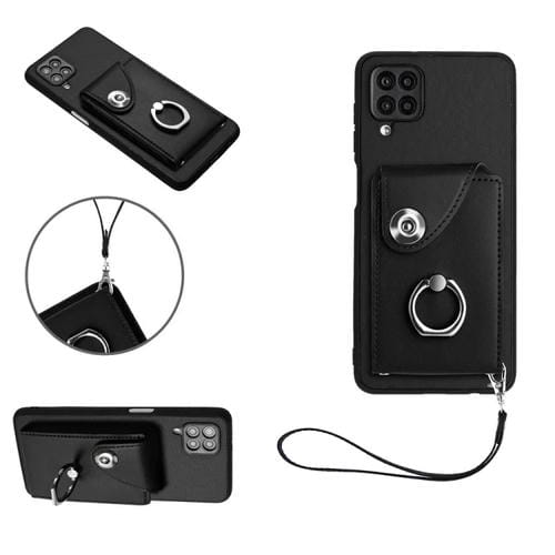 Funda para Teléfono Samsung Galaxy A12 de PU con Soporte para Anillo y Bolsa para Tarjeta con Cordón (Negro)