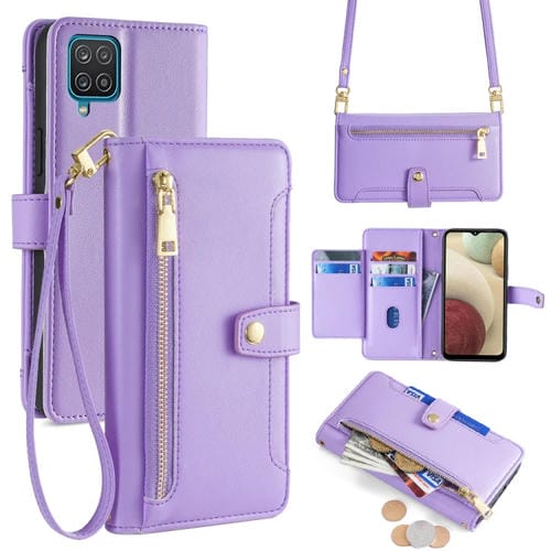 Funda de Cuero Samsung Galaxy A12 Lite Billetera Cremallera Cuerpo Cruzado Textura Oveja (Púrpura)