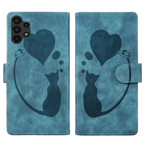 Estuche para Teléfono Samsung Galaxy A13 4G 5G A04 Cuero Relieve Gato Corazón con Bolígrafo (Azul)
