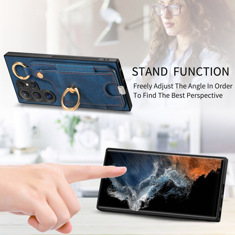 Estuche para Teléfono Samsung Galaxy A23 con Bolsa para Tarjeta con Anillo y Sensación de Piel Retro con Lazo para Colgar (Azul)