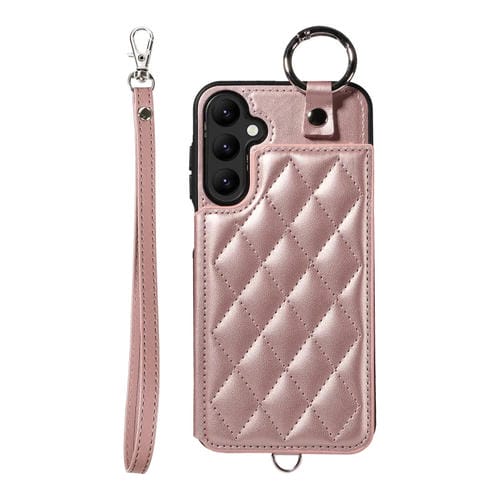 Estuche para Teléfono Samsung Galaxy A24 4G con Bolsa para Tarjetas Textura Rómbica y Cordón Corto (Oro Rosa)