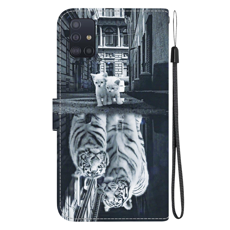 Funda para Teléfono Samsung Galaxy A51 5G Cuero Dibujo Coloreado Textura de Cristal (Reflejo de Tigre Gato)
