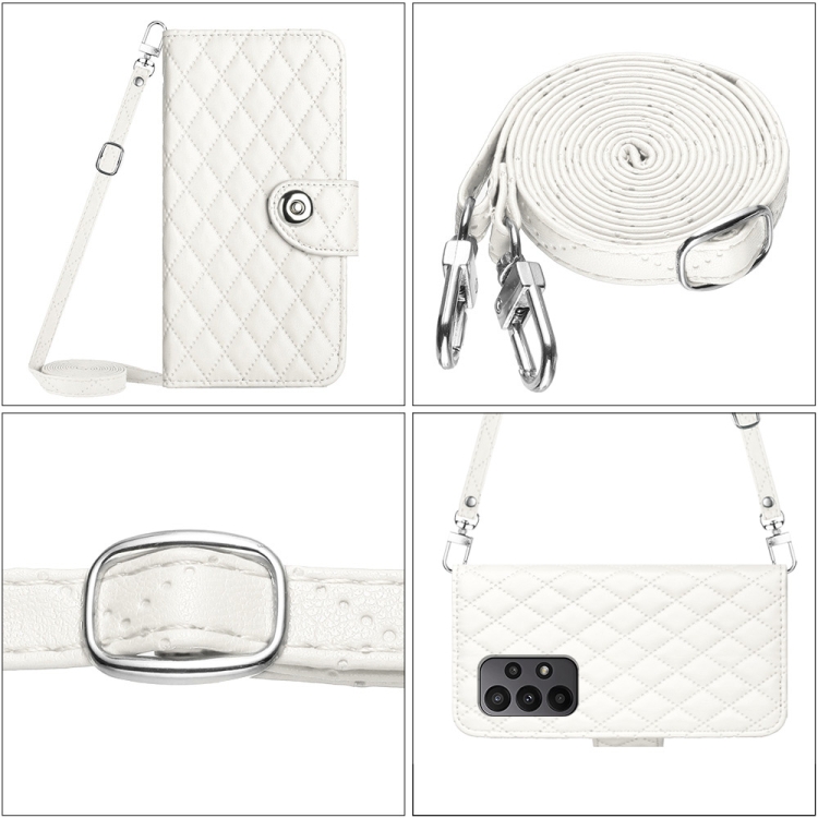 Funda de Cuero para Samsung Galaxy A52 4G y 5G con Tapa Textura Rómbica y Cordón Largo (Blanco)