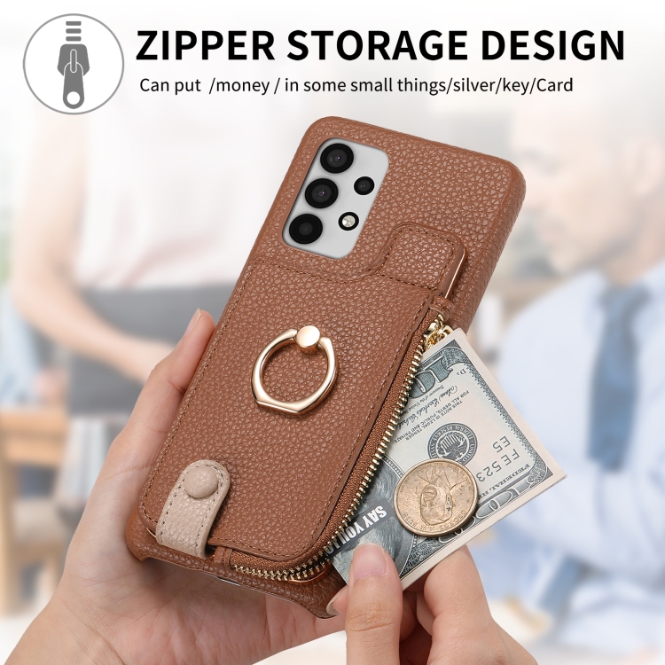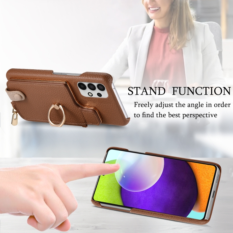 Funda para Samsung Galaxy A52 Litchi Leather Oil Edge Ring Zipper Wallet Back (Marrón)