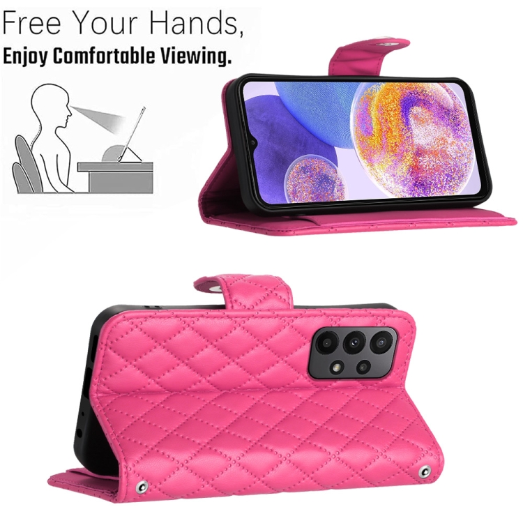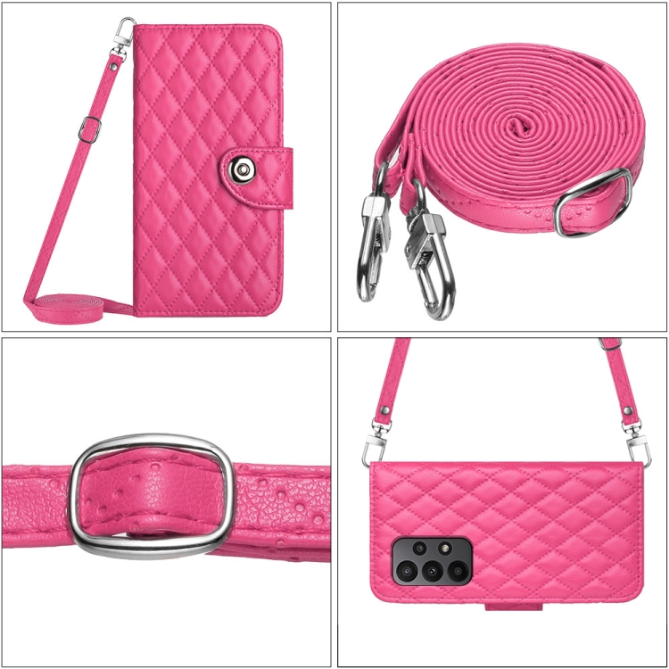 Funda para Teléfono Samsung Galaxy A53 5G con Tapa de Cuero Textura Rómbica y Cordón Largo (Rojo Rosa)
