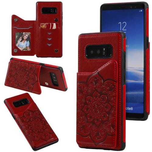 Estuche protector Samsung Galaxy Note 8 con patrón de flor, soporte, ranuras para tarjetas y marco de fotos (Rojo)