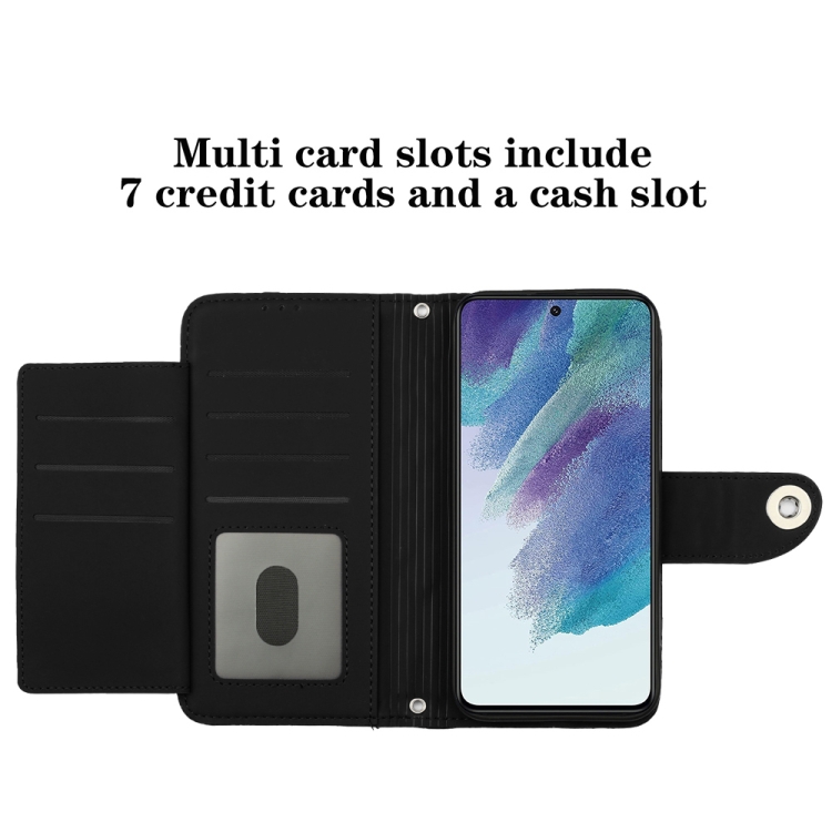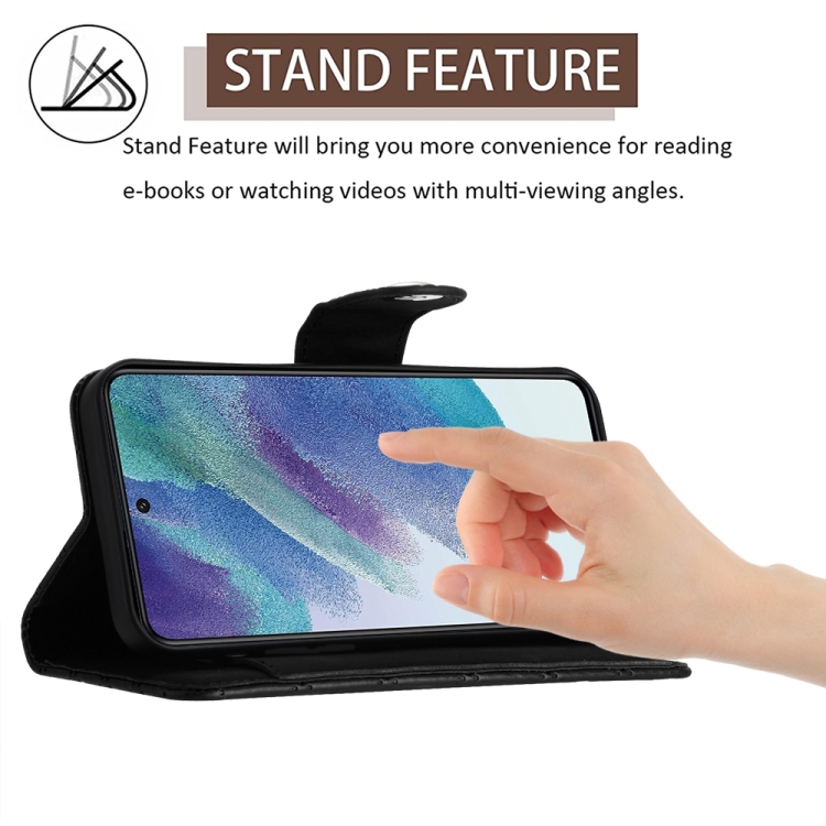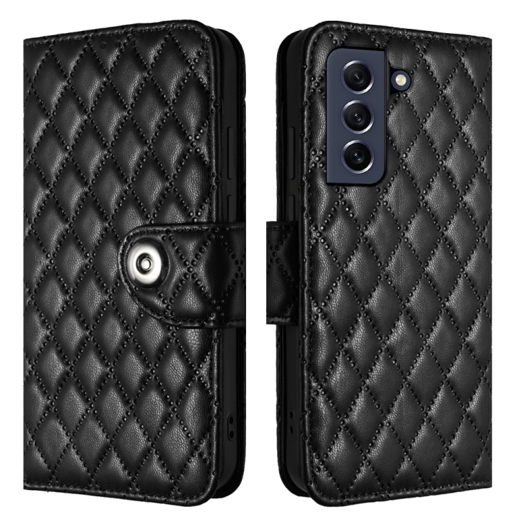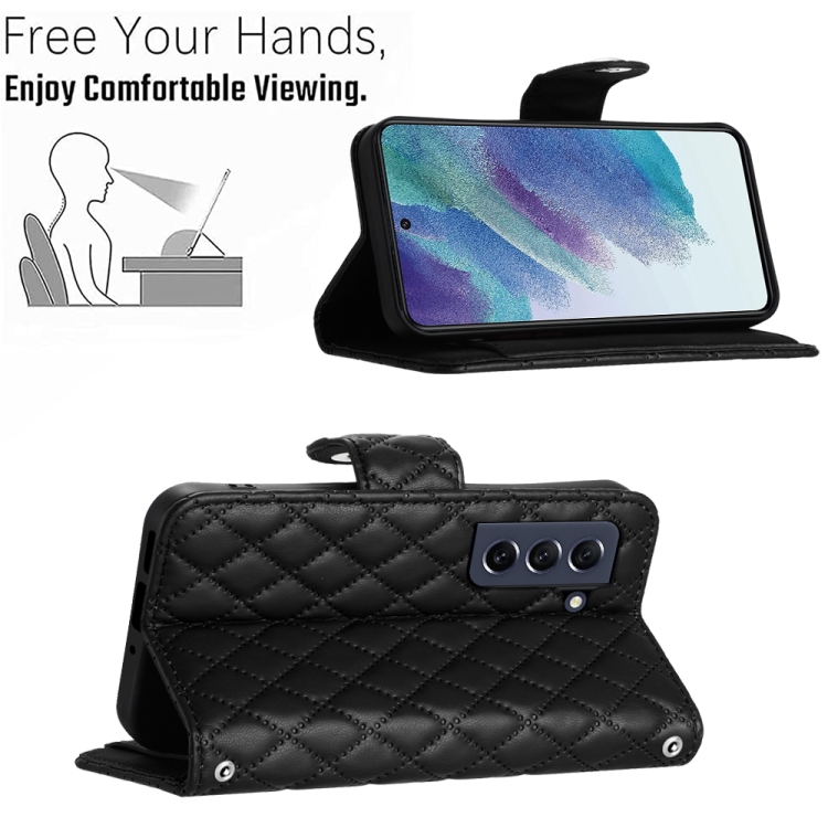 Funda para Teléfono Samsung Galaxy S21 FE 5G con Tapa de Cuero Textura Romboidal y Cordón (Negro)