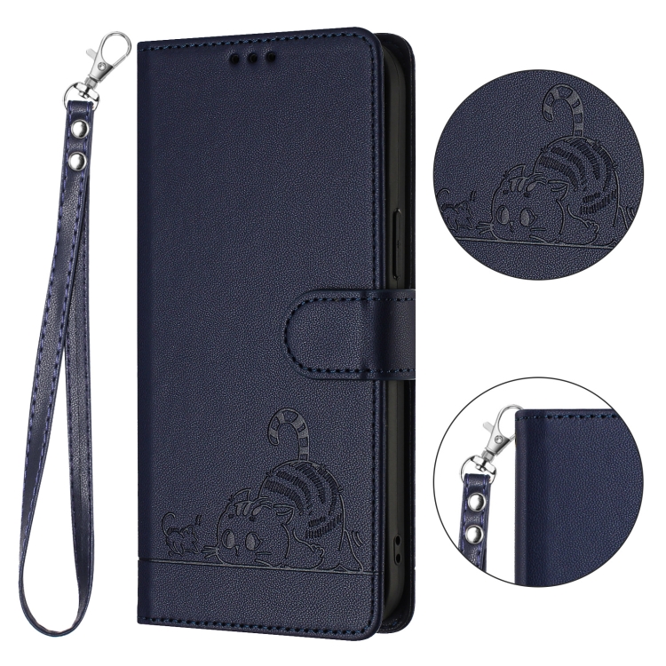 Estuche para Teléfono Samsung Galaxy S21 FE Cat Rat con Patrón en Relieve Rfid PU con Correa para Muñeca (Azul)