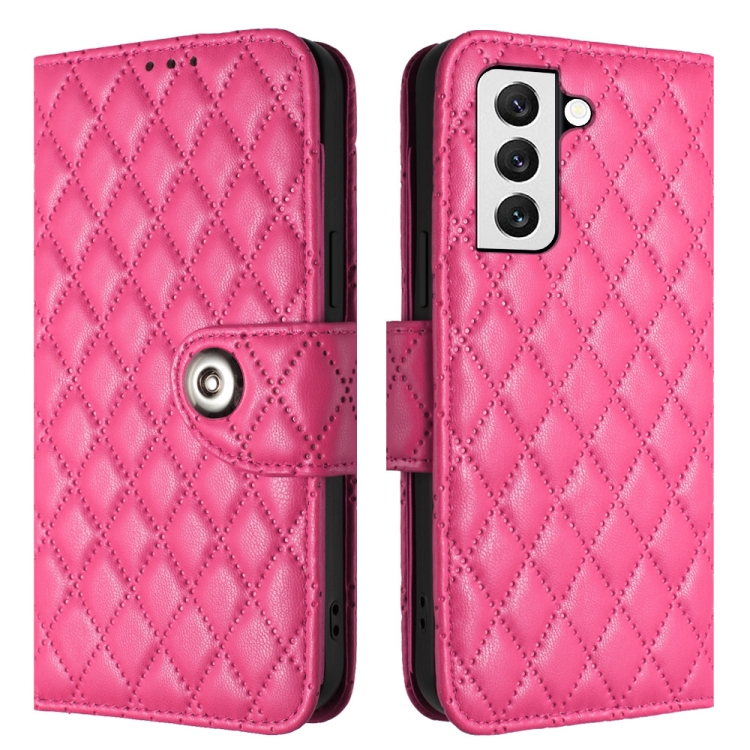 Funda para Teléfono Samsung Galaxy S22 + 5G Tapa de Cuero Textura Rómbica Cordón (Rojo Rosa)