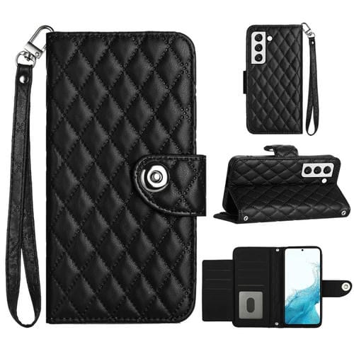 Funda para Teléfono Samsung Galaxy S22 + 5G con Tapa de Cuero Textura Romboidal y Cordón (Negro)