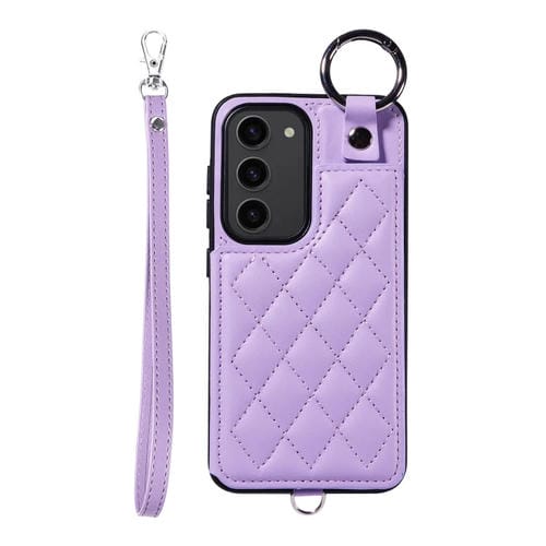 Estuche para Teléfono Samsung Galaxy S23 5G con Bolsa para Tarjetas Textura Rómbica y Cordón Corto (Púrpura)
