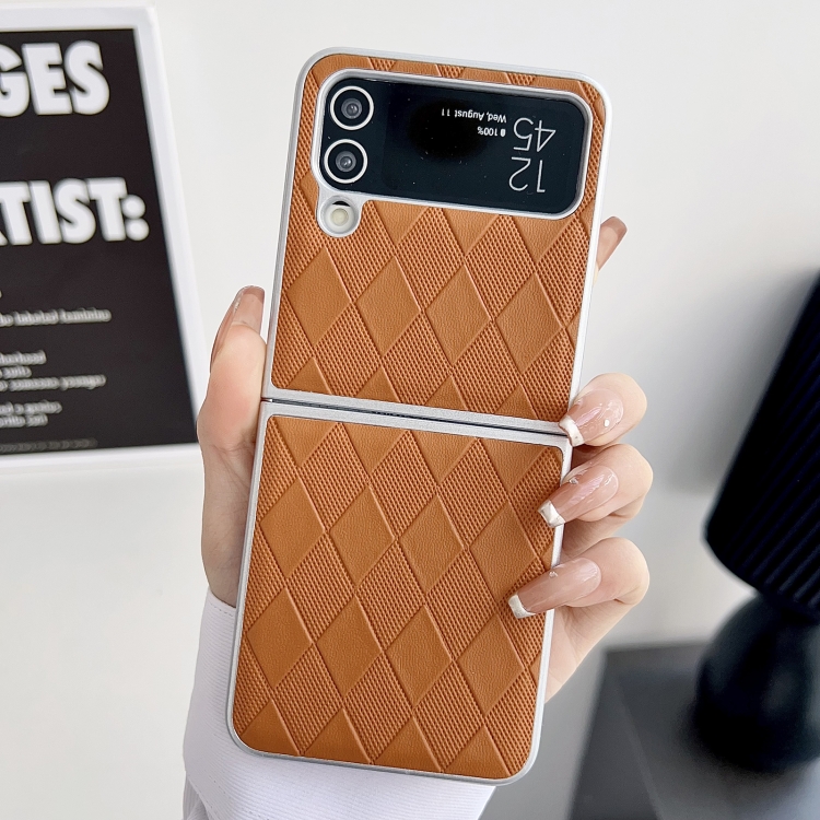 Funda para Teléfono Samsung Galaxy Z Flip4 5G Cuero a Cuadros con Pintura Nacarada y Forma de Diamante (Marrón)
