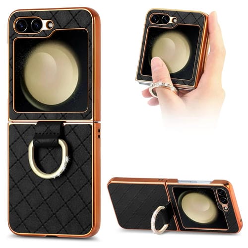 Funda para Teléfono Samsung Galaxy Z Flip5 5G con Anillo de Diamante Chapado en Rombos (Negro)