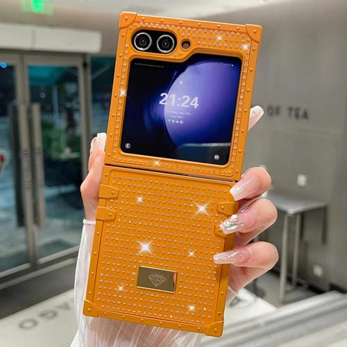 Estuche para Teléfono Samsung Galaxy Z Flip5 5G PC a Prueba de Golpes con Diamantes Completos y Logotipo (Naranja)