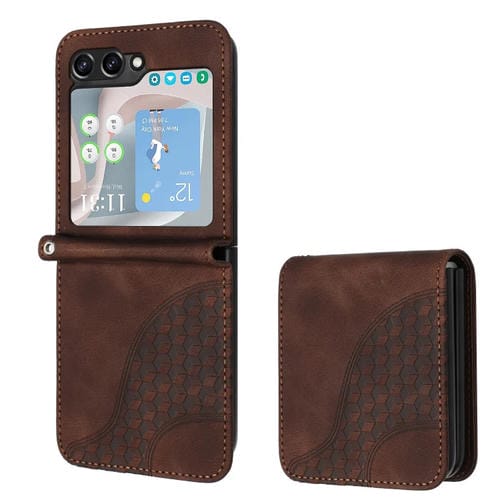 Funda para Samsung Galaxy Z Flip5 5G Yx0060 de Cuero con Relieve y Cabeza de Elefante con Cordón (Café)