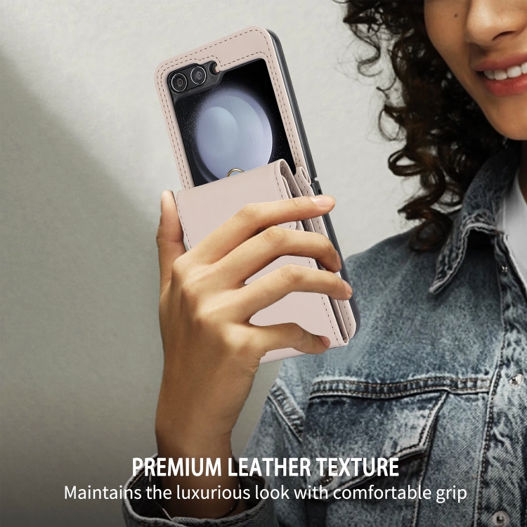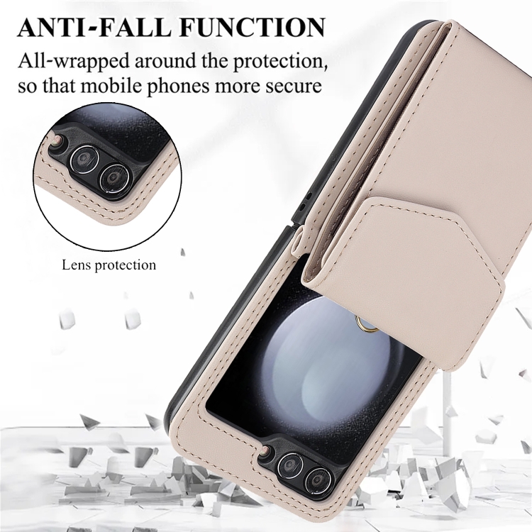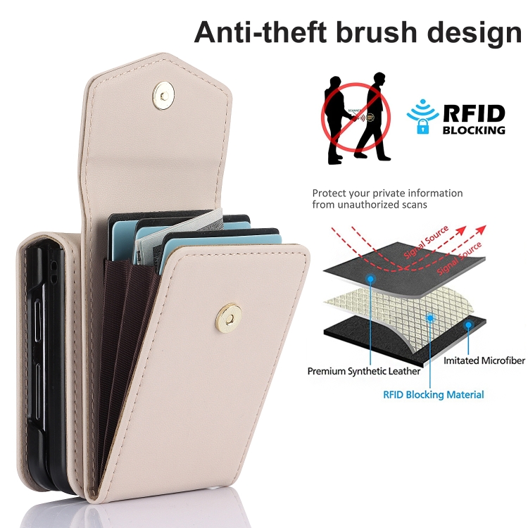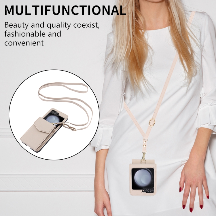 Estuche plegable para Samsung Galaxy Z Flip5 con RFID, ranuras para tarjetas y cordón largo (Albaricoque)