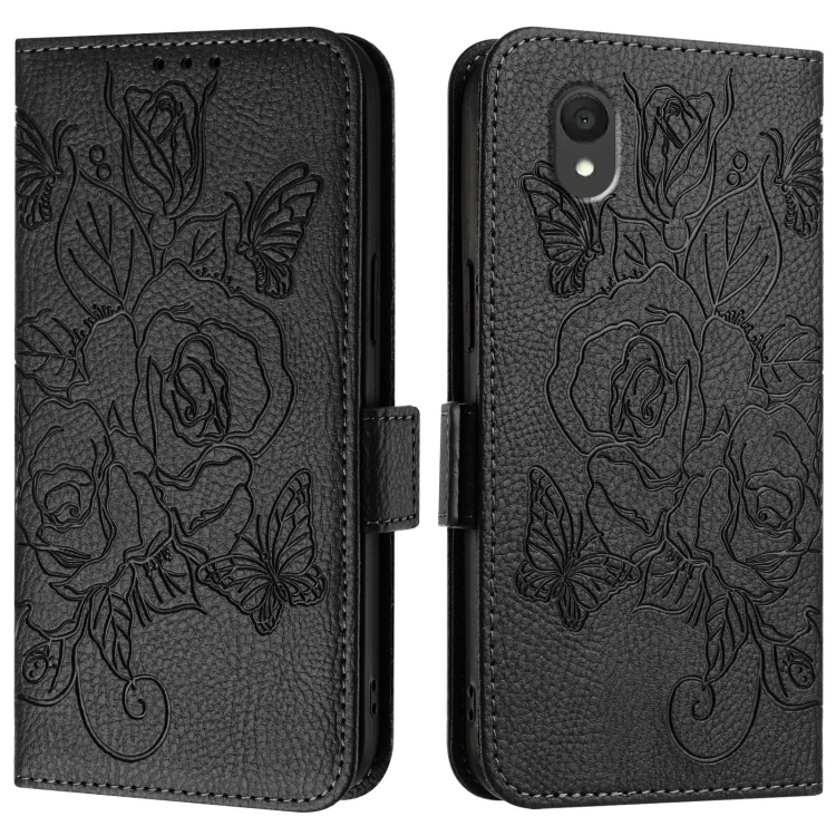 Funda de Cuero Antirrobo RFID para TCL 201 con Rosa en Relieve (Negro)