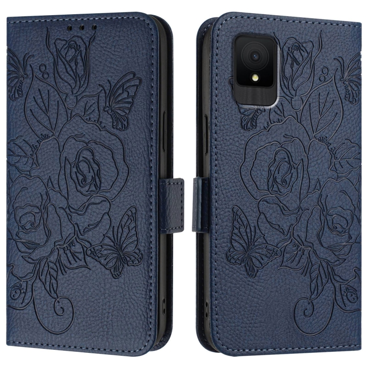 Funda de Cuero Antirrobo RFID para TCL 502 con Rosa en Relieve (Azul Oscuro)