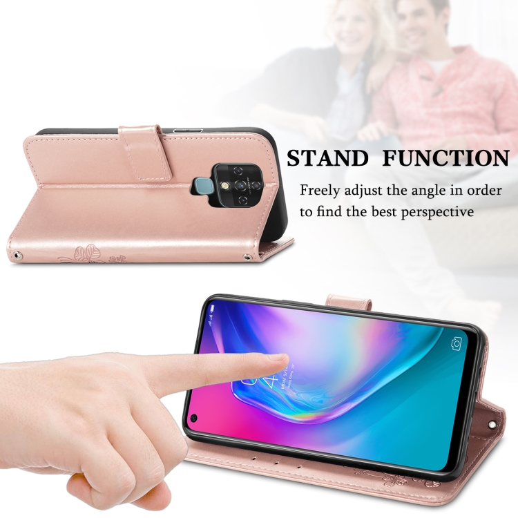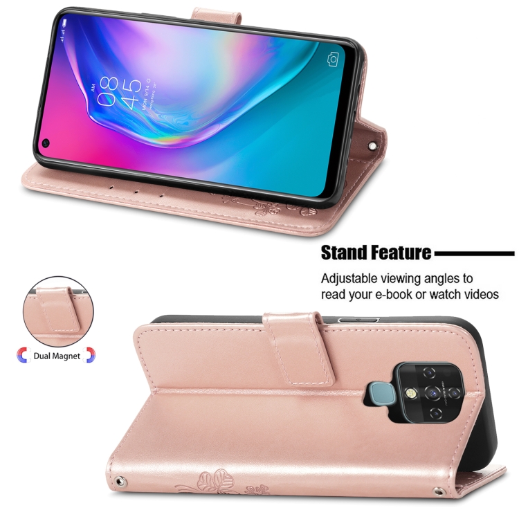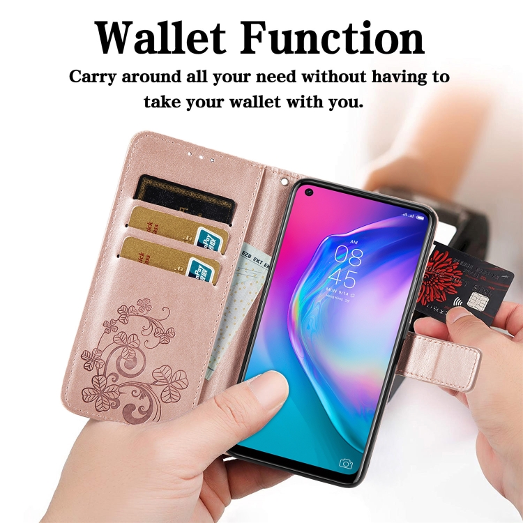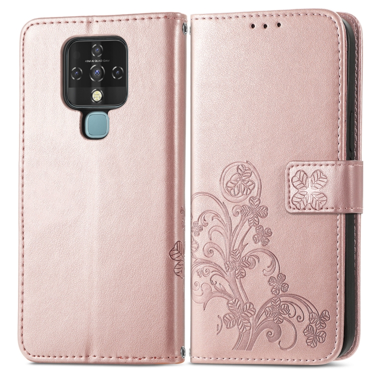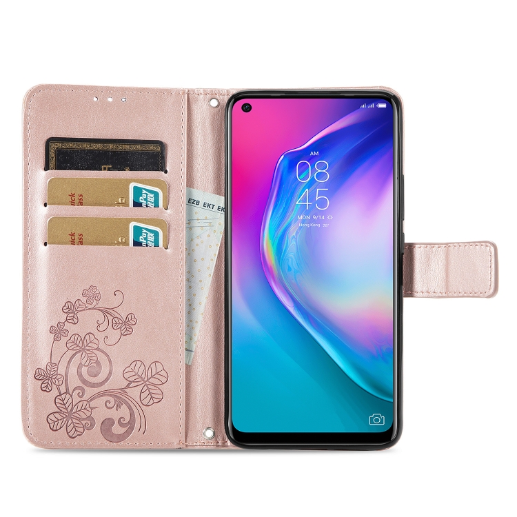 Funda de Cuero para Tecno Camon 16 Se con Cierre de Cuatro Hojas, Hebilla en Relieve, Ranura para Tarjeta y Soporte (Oro Rosa)