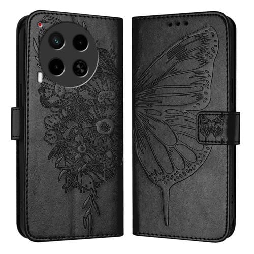Funda de Cuero para Tecno Camon 30 4G / 5G con Mariposa en Relieve (Negro)