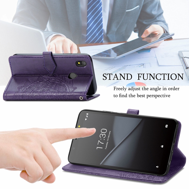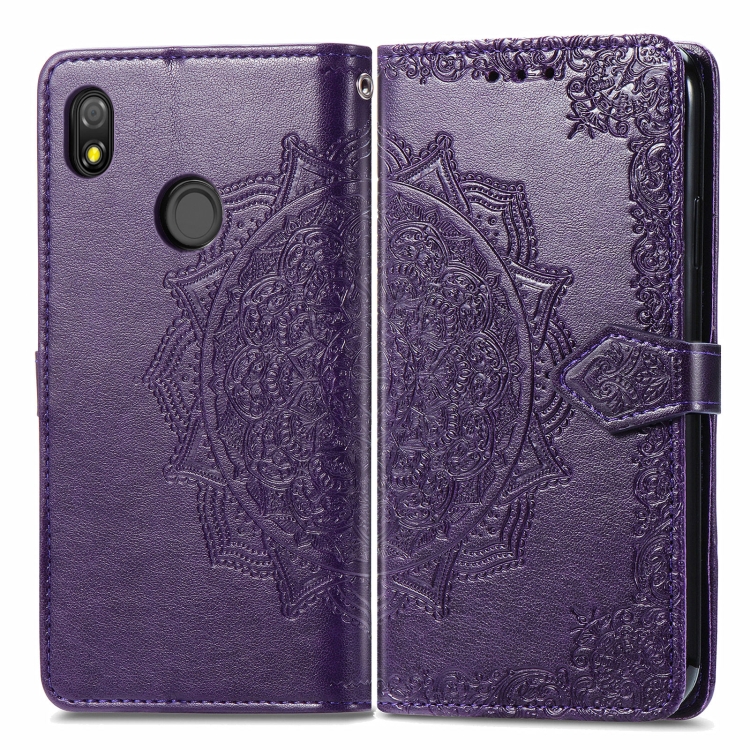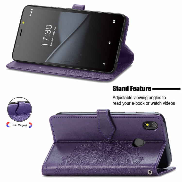 Funda de Cuero para Tecno Pop 3 Mandala Flower Horizontal Flip con Soporte, Ranura para Tarjeta, Billetera y Cordón (Púrpura)