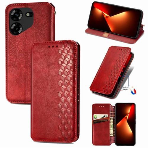 Funda de Teléfono Tecno Pova 5 4G Cubic Grid Cuero Magnético Prensado (Rojo)