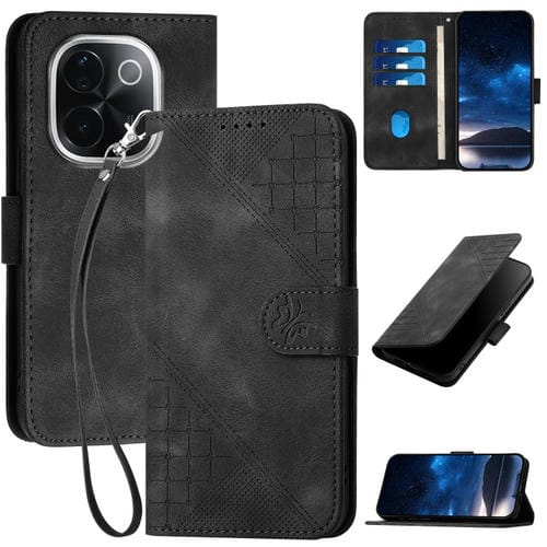 Para Vivo Iqoo Z9S Pro / T3 Pro 5G India Yx0080 Funda de Cuero con Tapa y Patrón En Relieve de Mariposa y Cuadrícula con Cordón (Negro)