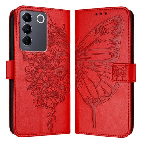 Para Vivo V27 5G / V27 Pro 5G Funda para Teléfono de Cuero con Mariposa En Relieve Global (Rojo)