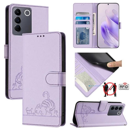 Para Vivo V27 Pro 5G Global Cat Rat Estuche para Teléfono de Cuero Rfid con Patrón En Relieve y Cordón (Púrpura)