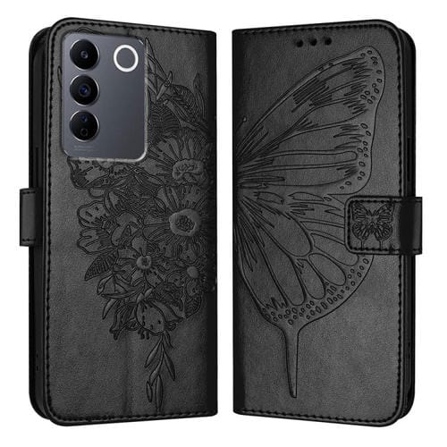 Para Vivo V27E 4G Global / T2 4G Global Funda de Cuero con Mariposa En Relieve (Negro)