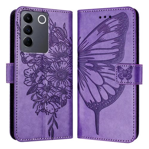 Para Vivo V27E 4G Global / T2 4G Global Funda de Cuero para Teléfono con Mariposa En Relieve (Púrpura Claro)