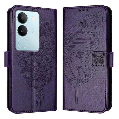 Para Vivo V29 5G Global / V29 Pro Funda de Cuero para Teléfono con Mariposa En Relieve (Púrpura Oscuro)