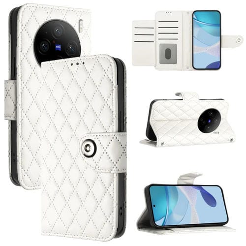 Para Vivo X100S Funda para Teléfono de Cuero con Tapa con Textura Rómbica y Cordón (Blanco)