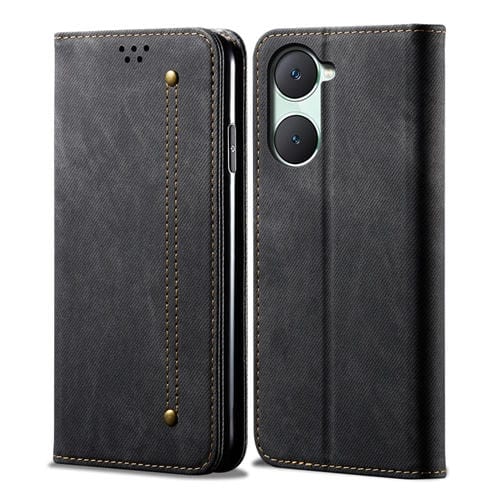 Para Vivo Y03 4G Funda de Cuero con Tapa con Textura Vaquera (Negro)