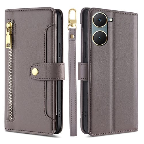 Para Vivo Y03 4G Funda de Cuero para Teléfono con Billetera con Cremallera y Cuerpo Cruzado con Textura de Oveja (Gris)
