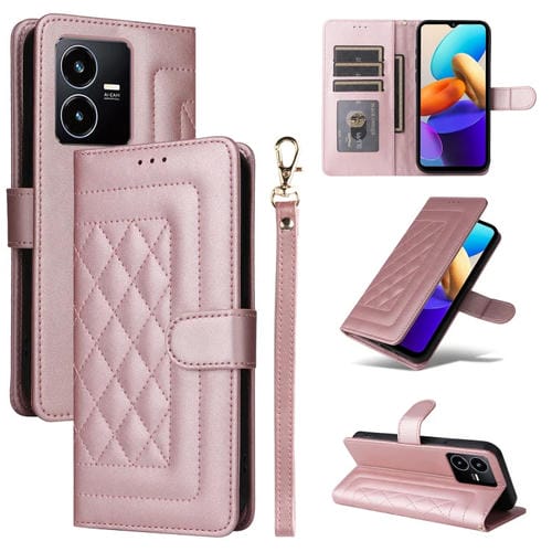 Para Vivo Y22S / Y35 Funda para Teléfono con Tapa de Cuero con Entramado de Diamantes (Oro Rosa)