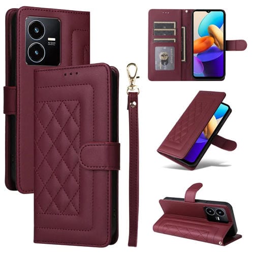 Para Vivo Y22S / Y35 Funda para Teléfono con Tapa de Cuero Diamond Lattice (Rojo Vino)