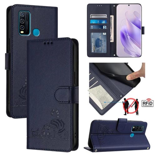 Para Vivo Y30 4G Global Cat Rat Estuche para Teléfono de Cuero Rfid con Patrón En Relieve y Cordón (Azul)