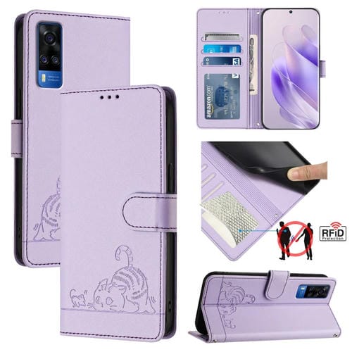 Para Vivo Y33 4G 2021 Funda para Teléfono de Cuero Rfid con Patrón En Relieve Cat Rat y Cordón (Púrpura)