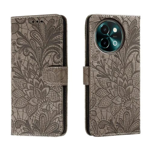 Para Vivo Y38 Funda para Teléfono de Cuero con Tapa y Estampado de Flores de Encaje (Gris)