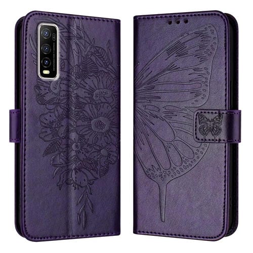 Para Vivo Y70S Funda de Cuero con Mariposa En Relieve (Púrpura Oscuro)