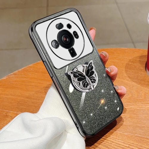 Para Xiaomi 12S Funda para Teléfono de TPU con Soporte de Mariposa con Brillo Degradado Ultra Plateado (Negro)
