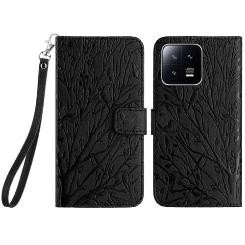 Para Xiaomi 13 Pro Tree Birds Funda de Cuero para Teléfono con Patrón En Relieve (Negro)