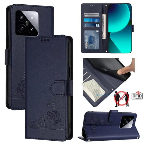 Para Xiaomi 14 5G Cat Rat Funda Para Teléfono De Cuero Rfid Con Patrón En Relieve Y Cordón (Azul)