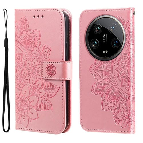 Para Xiaomi 14 Ultra Funda De Cuero Con Estampado De Flores De 7 Pétalos (Oro Rosa)