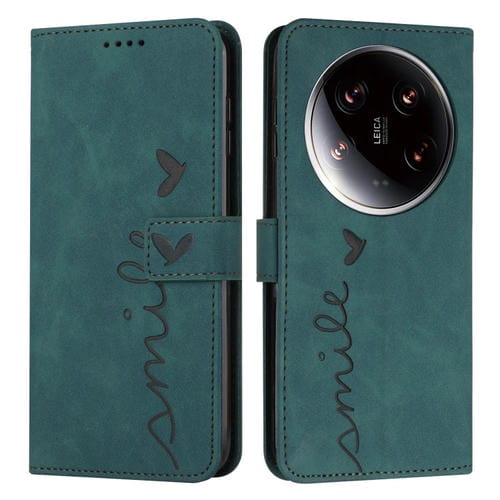 Para Xiaomi 14 Ultra Skin Feel Heart Funda Para Teléfono De Cuero En Relieve Con Cordón Largo (Verde)