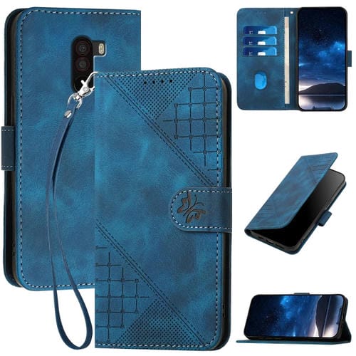 Para Xiaomi Pocophone F1 Yx0080 Grid Butterfly Patrón En Relieve Funda de Cuero con Tapa para Teléfono con Cordón (Azul Oscuro)